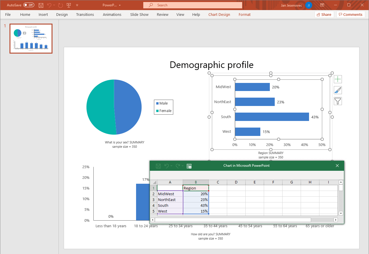 Whilst I could have done most of these changes in Displayr, the aim of this example is to show that this can also be done in PowerPoint without losing the ability to update the charts at a later time and keep the design intact. My PowerPoint slide now looks like this: