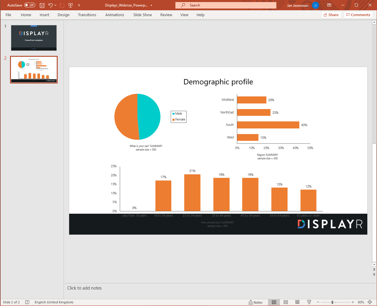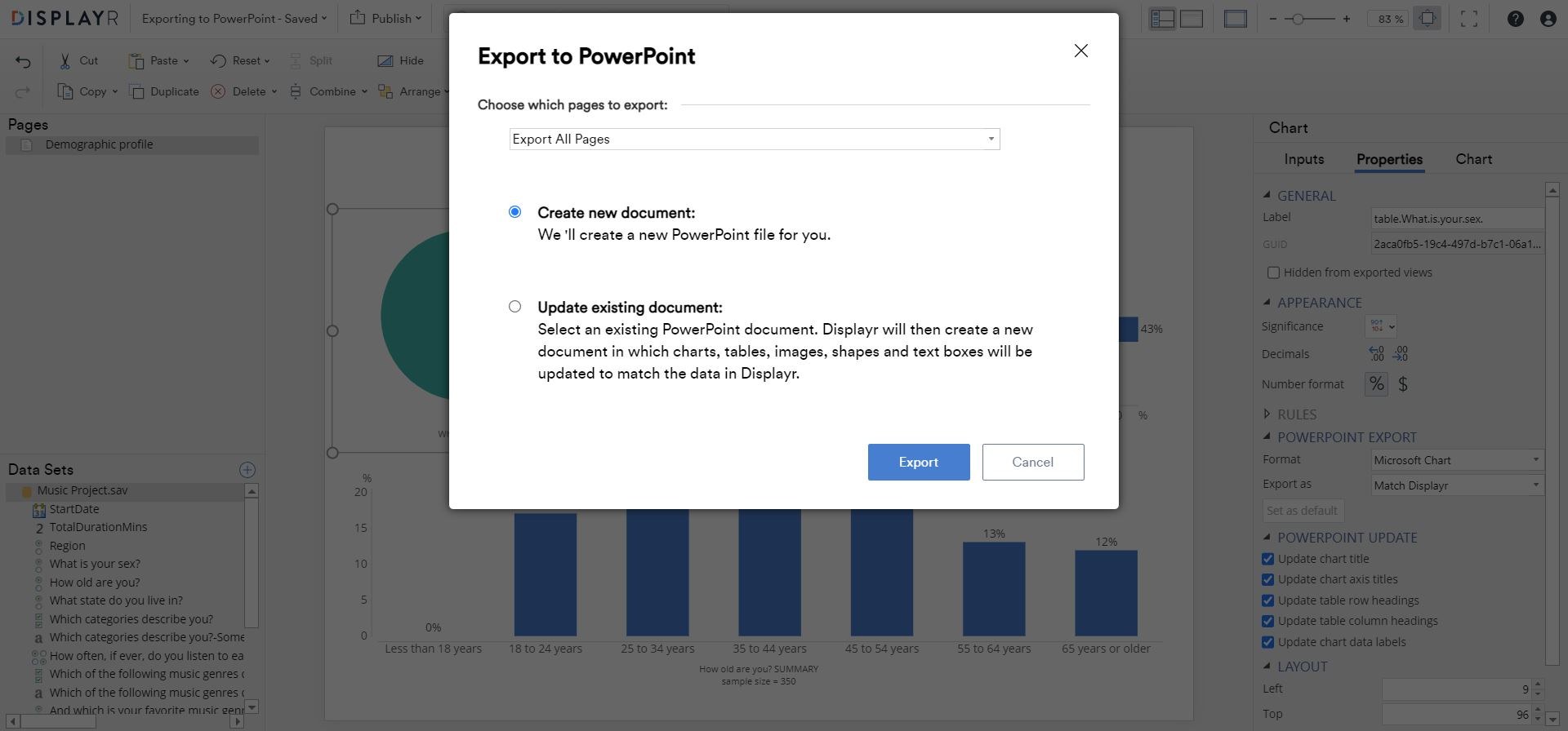 The idea is to get the vast majority of analysis and data outputs created in Displayr before exporting the document to PowerPoint and finalizing the report. I will also show you an easy way to make changes and update your PowerPoint reports.