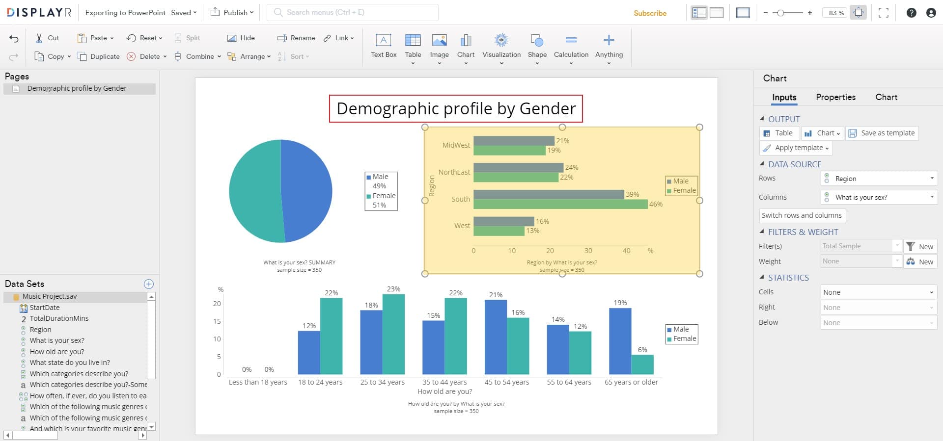 Now, let’s say that we wish to make a change to our report and show Region and Age split by Gender. I could do this by going to my data tables, finding the data, and manually adding it to the PowerPoint chart. After all, we can edit the chart exported from Displayr.