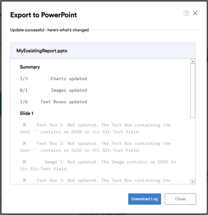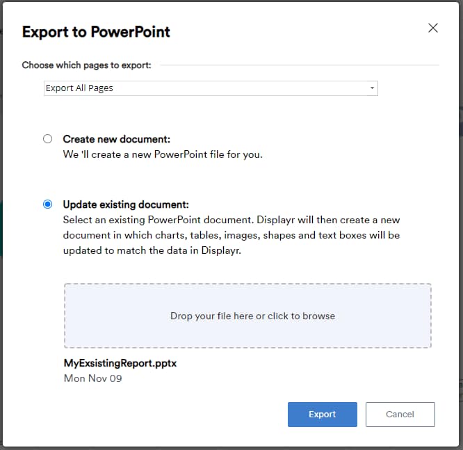 To update the PowerPoint report, go to Publish > Export Pages > PowerPoint, but this time instead of creating a new document I selected Update existing document. I then dragged and dropped my PowerPoint document created in Step 6 into the blue box and clicked on Export.