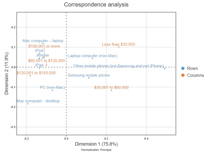 There are a few variations on the technique of correspondence analysis (including correspondence analysis of square tables, multiple correspondence analysis, and correspondence of multiple tables), but in this post I focus on the most common technique, which could be called traditional correspondence analysis. This is a technique originally derived to understand the patterns in contingency tables, but it can readily be applied to other kinds of data as well. In this post, I show you how to set up your correspondence analysis in Displayr.