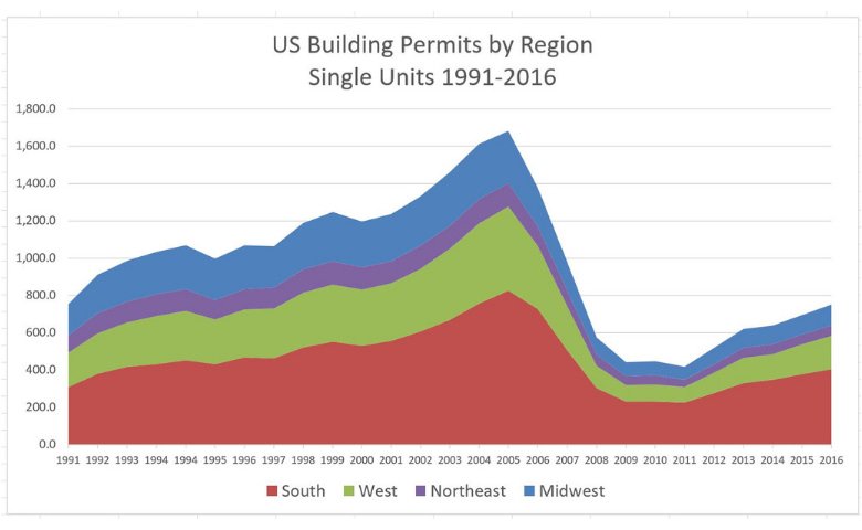 The easiest way to create an area chart in Excel is to first set up your data as a table. The first column should contain the labels, and the second column contains the values. To create a stacked area chart where the values are split into sub-groups, create a column for each of the sub-groups. In this example, we’ll use a data set that shows annual building permits by region for single-unit homes in the US from 1991 through 2016. The following data set shows total permits issued (in thousands) for each region by year. The first column contains the y-axis label (year) with a column for each region. The values in the table represent the number of permits.