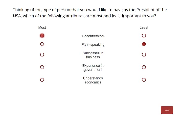 Our data set asked 315 Americans ten questions about the attributes they look for in a U.S. president. Each question asked the respondents to pick their most and least important attributes from a set of five. The attributes were: