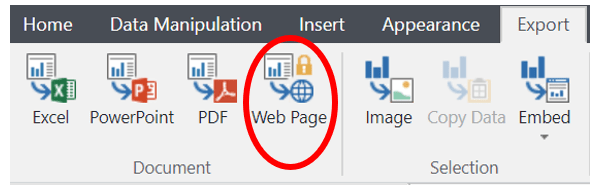Once your data is all hooked up to the analyses and visualizations in the template, it's time to publish your dashboard! To publish your dashboard as a web page, go to Export in the ribbon and click Web Page. This will create your published dashboard. You can share this link with anyone you like, and they can navigate through the dashboard. The instructions in the template will be hidden in the published version. If you need to go back and change anything, you can just click Embed > Update All and your published dashboard will update.