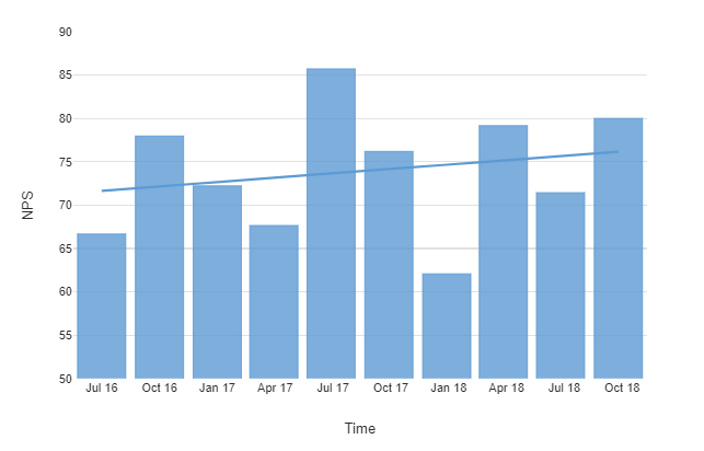 It is also useful to see how NPS changes over time, particularly if you have implemented new strategies aimed at improving the customer experience. This is best done with a column or line chart (see below), where the cases have been aggregated over sufficiently large time periods so that there are enough cases in each period.