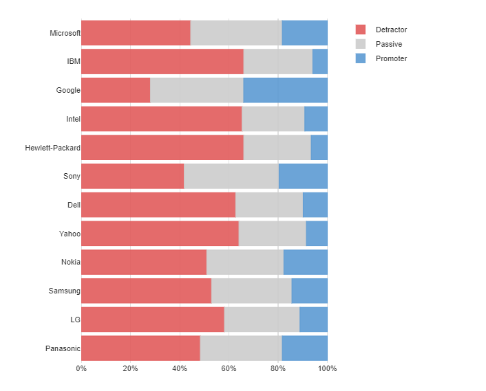 You can also simply aggregate ratings by promoter group when visualizing NPS (see below). This is ideal if there is a large number of passives, as it highlights the potential to improve NPS by nudging them to become promoters.