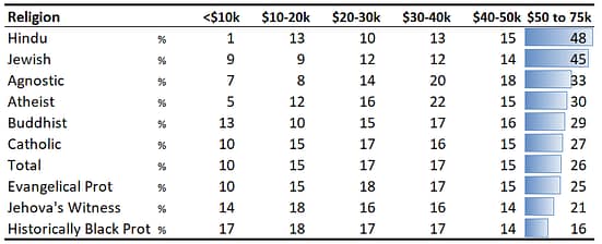 We can improve on this further with a bit of conditional formatting. This really brings to light the most striking aspect of the data – the massive difference between the religions in terms of higher incomes.