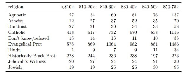 - The original table also allows us to quickly draw conclusions about the distribution of the data. The biggest of the shown religions is Evangelical Protestant. The $50-75K is the biggest of the income groups.