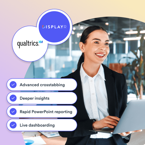 If you are under pressure to deliver powerful insights but faster the Qualtrics + Displayr partnership will help. Benefit from deeper analysis, advanced crosstabbing capabilities, rapid PowerPoint reporting, and live dashboards. Clarity from insights at your fingertips.