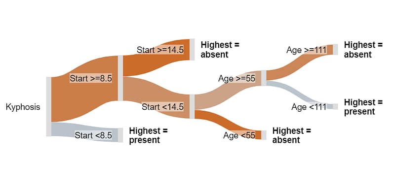 The tree below is the standard output R decision tree visualization from the R tree package. This example shows the predictors of whether or not children’s spines were deformed after surgery. The tree predicts the Presence of Absence of deformation based on three predictors: