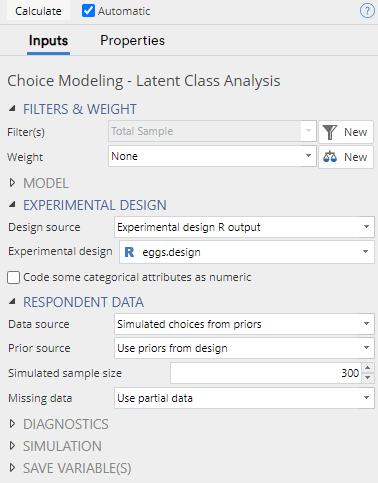 Alternatively, if you have supplied a choice model experimental design output, there is an additional Prior source control which has the option Use priors from design. As the name suggests, Displayr will use any priors provided in the design output to generate the simulated data. If no priors are present, then Displayr will use priors of zero. This will cause the simulated choices to be random and independent of attributes.