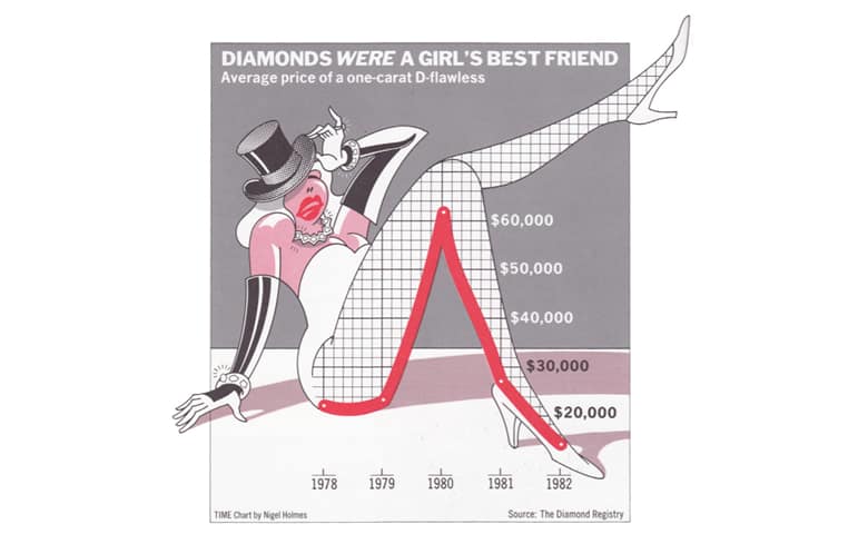 The obvious point of overlying the line chart on the dancer’s leg is to attract attention. Tufte writes that “the operating moral premise of information design should be that our readers are alert and caring”. Perhaps this was true when Tufte wrote this in 1990, but I doubt it. Information overload is the norm, and care is the victim of information overload.