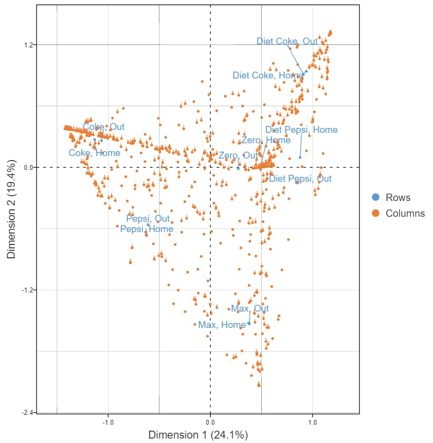 The table below shows the raw that we used to compute correlations above. Each row represents a person. Each column indicates the consumption of the different brands either at home or out and about. Is it OK? Raw data is usually OK, provided that the data is either binary or numeric. And, raw data for unordered categorical variables (e.g., occupation, brand preference), will not work, as the data has no meaningful scaling (i.e., averages do not make sense). In this specific case, we have a few rows with no data, and that causes a problem. But, once they are removed, we can get a useful map, as shown below.