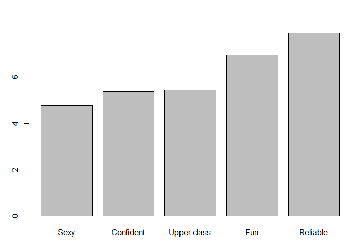 The results below show that Reliable and Fun are positive predictors of preference. You could run the code barplot(head(coefficients, 5)) to see that at the other end of the scale Unconventional and Sleepy are negative predictors.