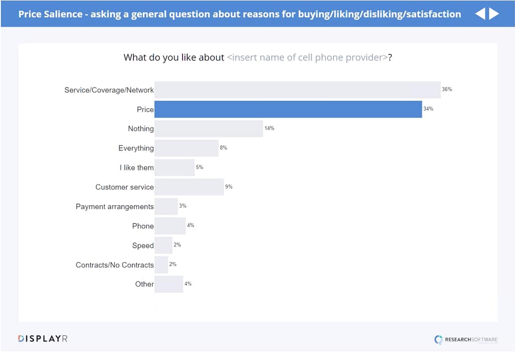 The first and simplest approach is to ask about reasons of preference for choosing something and to see how many times the price is mentioned. In the example below, I have asked people why they like their current cell phone provider. As you can see, price is the second most important factor. So, price is clearly very important within this market.