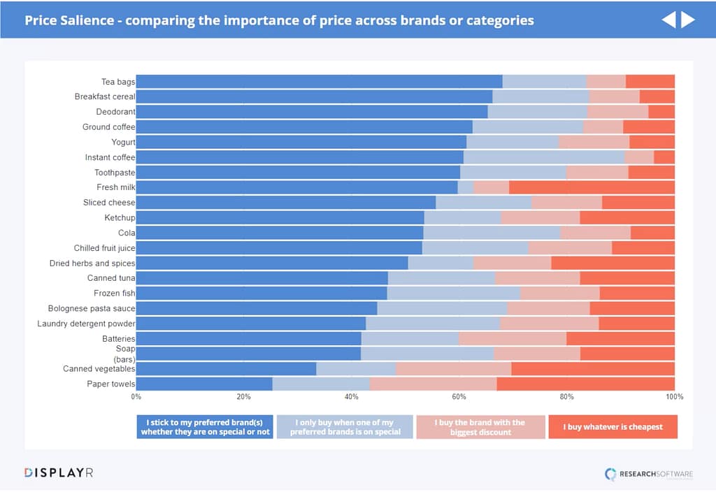 As you can see, the last dark blue bar is the row for paper towels and it shows that only 25% of people say they ignore that price if it’s their preferred brand. By contrast, the blue bar in the top row for teabags shows that about 68% of people pay no attention to the price of their preferred brand.