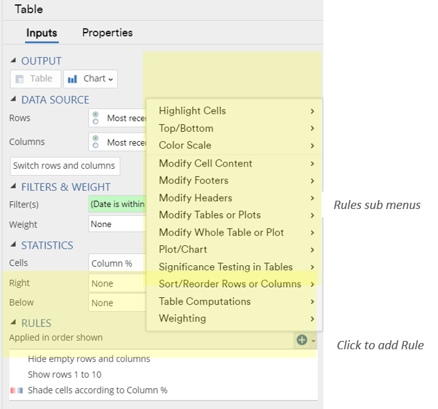 Once you have created a Table or Chart and selected it, the Rules menu is available on the Inputs tab of the Object Inspector panel.