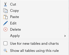 As you create rules, they are added to the list in the box in the Object Inspector. From here you can set the order that they are applied (by dragging and dropping), or right click for more options (see below). Importantly, you can copy a rule and then paste it into the same box for other Tables or Charts, which immediately applies the same rule settings. You can also make selected rules the default for any new outputs (“Use for new tables and charts”).