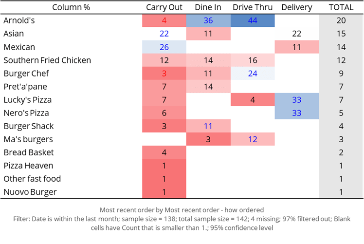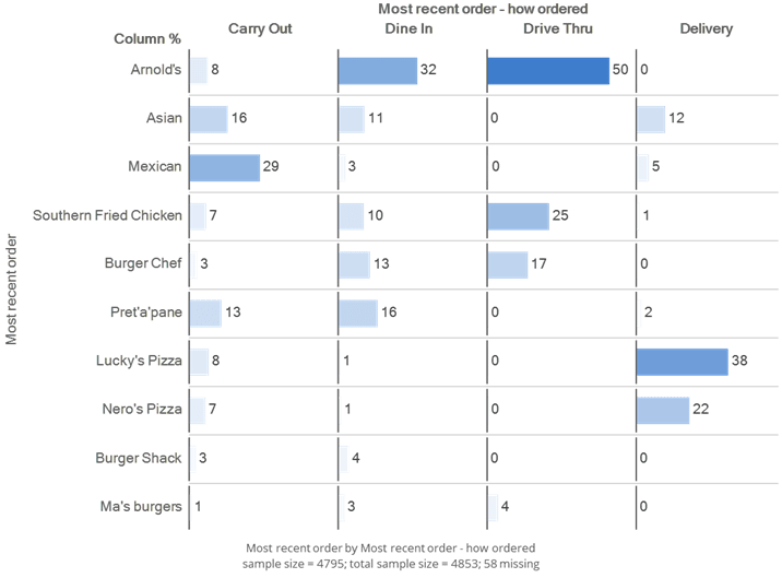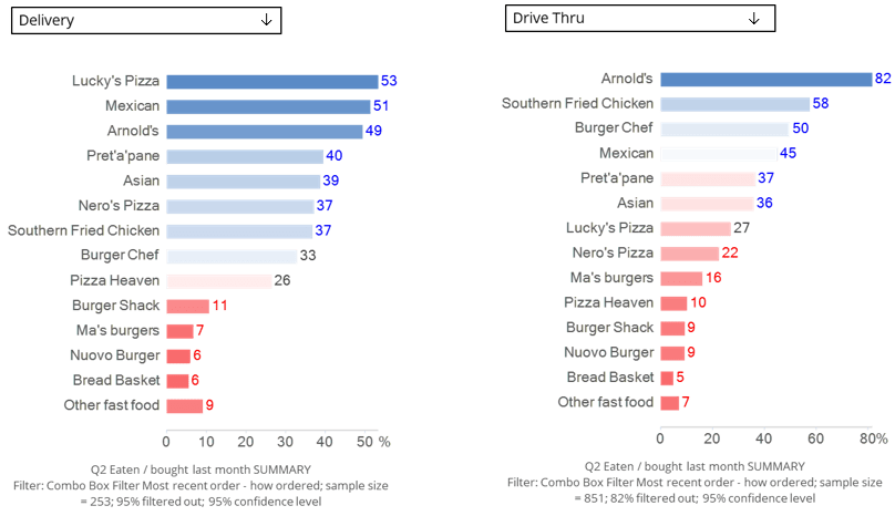 Here the chart on the left (with a filter set to ‘Delivery’) has a rule applied to Sort Rows Automatically when the data changes. As soon as the filter is changed to Drive Thru (on the right), the chart updates with the new rank-ordering. Displayr cleverly leaves “Other” at the bottom, which would be the convention in market research.