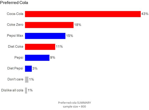 You can even make the format of a chart conditional on the items containing specific text. In this example, any category containing “Coke” or “Coca” has been set to appear red. Any category containing “Pepsi” has been set to appear blue.