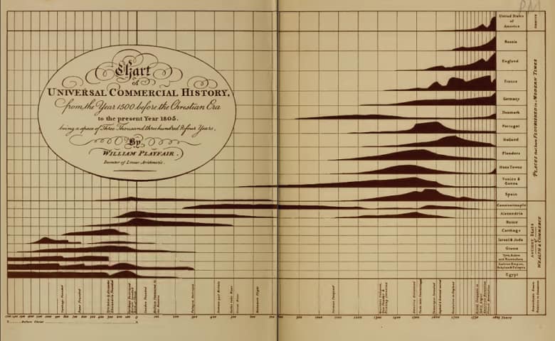 Both of my favorite data visualizations of all time are small multiples. The first one, which I’ve shown below, is more than 200 years old. This chart does an amazing job of summarizing the commercial history of the world. It allows us to easily just how dark the Dark Ages were, with only Constantinople and Denmark thriving (apparently knowledge of Asia and the Americas had yet to reach the designer of this chart). It also clearly shows that both the French and American revolutions crippled these respective economies. The less educated, such as myself, can even learn some history from the chart! For example, I had never heard of the Hanseatic League prior to seeing this data visualization (“Hans Towns”), but since finding this chart have not only learned of their existence, but even visited a few.