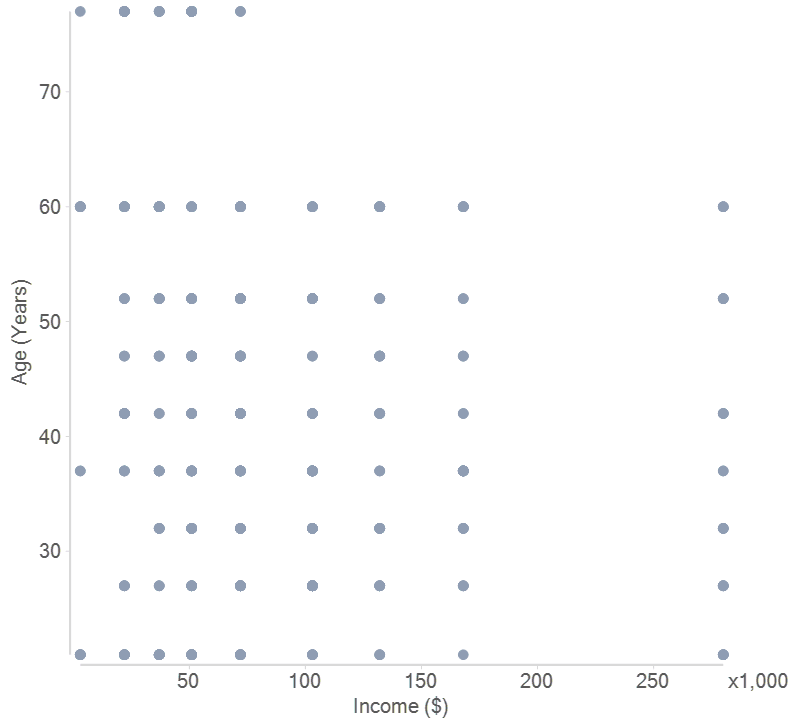 The scatter plot below shows age by income. This visualization exhibits the telltale sign of overplotting, which is that the data appears in neat rows and columns. There is no way to determine from this visualization if, say, there is only one person aged 60 with an income of $50,000 or more. See "What is Overplotting" for a discussion of different causes and remedies for overplotting.