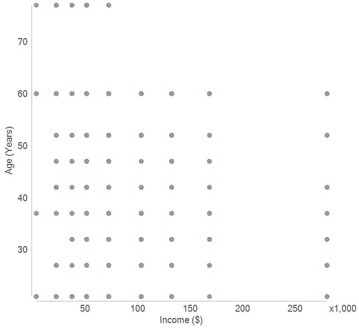 The scatter plot below shows age by income. This visualization exhibits the telltale sign of overplotting, which is that the data appears in neat rows and columns. There is no way to determine from this visualization if, say, there is only one person aged 60 with an income of $50,000 or more. See “What is Overplotting” for a discussion of different causes and remedies for overplotting.