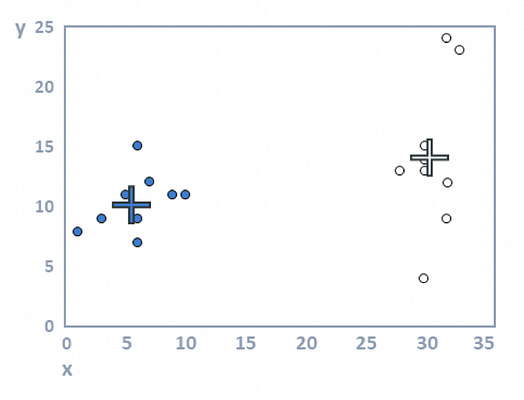 Step 3: Compute cluster means. For each cluster, the average value is computed for each of the variables. In the plot below, the average value of the filled dots for the variable represented by the horizontal position (x) of the dots is around 15; for the variable on the vertical dimension, it is around twelve. These two means are represented by the filled cross. Or, stated slightly differently: the filled cross is in the middle of the black dots. Similarly, the white cross is in the middle of the white dots. These crosses are variously referred to as the cluster centers, cluster means, and cluster medoids.