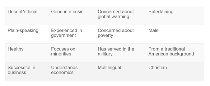 Consider the problem of working out what capabilities people would most like in the President of the United States. Asking people to rate the importance of each of the following characteristics would likely not be very useful. We all want a decent and ethical president. But we also want a president who is healthy. And the President needs to be good in a crisis.