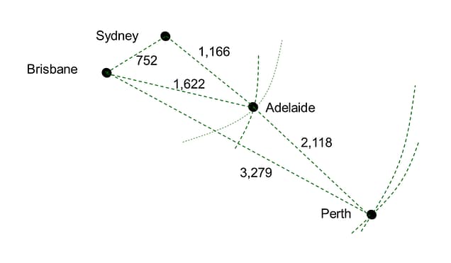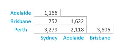 To illustrate the basic mechanics of MDS it is useful to start with a very simple example. The distance matrix below shows the distance, in kilometers, between four Australian cities. From these distances alone, we can reconstruct the map (shown below) which shows the distance between the cities.
