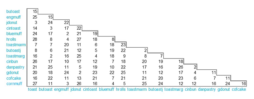 The distance matrix below shows the perceived dissimilarities between 15 breakfast baked goods, where a high number means that the subject rated them as being very dissimilar, and a lower number indicates the pair of baked breakfast goods are highly similar.