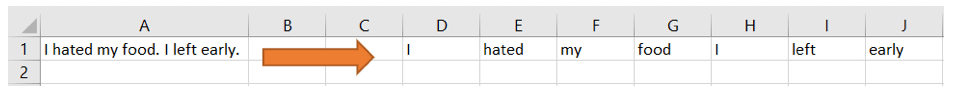 While many software programs now include tools for data analysis, splitting text responses can be used as a basic means for analyzing. This process is commonly referred to as tokenization, named for the resulting text segments which are called tokens. This can be useful when analyzing open-ended survey responses, tweets, or online reviews. In the example of the text string “I hated my food. I left early.”, splitting the text by spaces and punctuation into the individual words allows for the tokens to be counted or transformed.