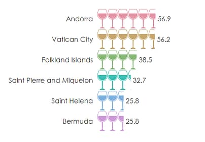 Andorra and the Vatican City come out of absolutely nowhere to trounce the rest of our top countries for wine consumed per capita. This visualization shows some of the most concentrated areas of wine drinkers. Tiny Vatican City, with an area of 44 hectares and just 1000 citizens, manages to pack away a stunning 56.9 liters per capita. It must be all those clergymen running about!
